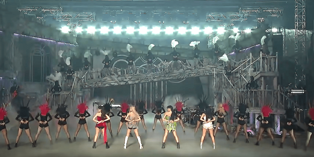 What I notice is how different the set looks now. It’s all shiny and nickel plated. It’s a cityscape—Art Deco style—like Jisoo’s corset. The set designer is over his/her COVID freak out and wants to end on an optimistic note. No more blackened trees and run down buildings. Anyway, the girls are almost entirely singing live and you know this because they have to practically shout over the backing track of their own vocals.