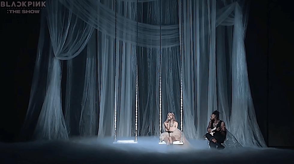 Ohhhh, it’s the intro to Rose’s song which is about a passionate couple that break up abruptly, because the last words she says are, “And then it all just stopped.” Then we hear the opening chords of her song “Gone.” This part starts off with a pre-recorded bit like a music video before it fade cuts to Rosé sitting on a giant swing singing live with Justin sitting next to her playing acoustic. Very cool look to the set and I really like this song.