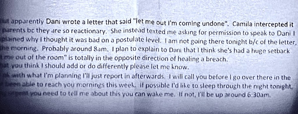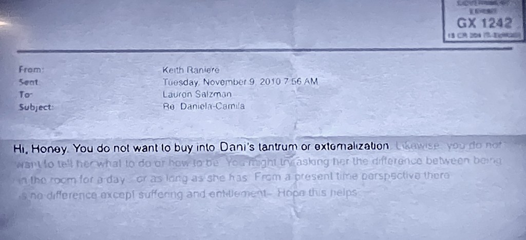 Lauren and Keith exchanged emails where Lauren would tell him things Daniela had said and Keith would advise Lauren on what to say in reply. Daniela had written a letter that said, “Let me out, I’m coming undone.” Keith advised Lauren to not give in to her “tantrums.”