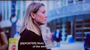 We hear voice overs of various reporters talking about Keith’s impending sentence. The camera cuts to various headlines, including one from Emily Saul’s paper, The New York Post, “GVILTY AS SIN.” I like that one.