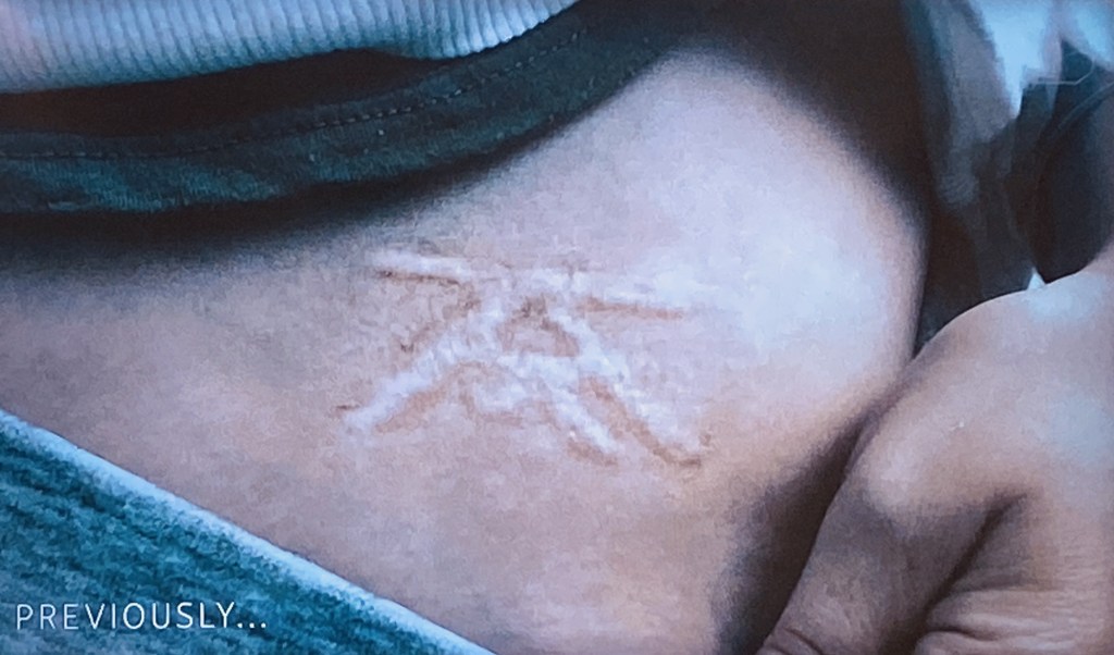 We cut to India talking with “Jill.” It gives an almost comical effect, because Jill’s head is pixelated out and it just looks bizarre to see one pixelated head talking to India in close up. Anyway, they are talking about their brands. India tells her that she opted to get her brand tattooed to disguise it. She shows Jill who is really impressed by how well the scar is concealed.